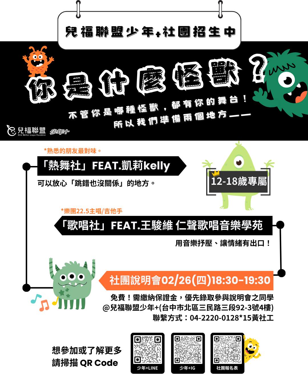 宣傳圖1 報名表單:https://forms.gle/4bV8wi4m2hcZBJGk9 社團說明會:115/02/26(四)18:30-19:30 12–18歲限定|免費參加,僅需繳交保證金500元/社,說明會主要供同學了解社團規範與權益,將「優先」錄取實際到場參加說明會之同學,實際錄取名額將依說明會當日出席狀況調整。 喂~你是什麼怪獸? 有的怪獸一聽到音樂,身體就忍不住動起來; 有的怪獸比較安靜,但心裡一直有想唱出來的旋律。 不管你是哪種怪獸,都有你的舞台! 所以我們準備了兩個地方—— 「熱舞社」FEAT.凱莉kelly 舞蹈老師 「歌唱社」FEAT.王駿維 仁聲歌唱音樂學苑老師(樂團22.5主唱/吉他手) 地點|兒福聯盟少年+(台中市北區三民路三段92-3號4樓) \還在猶豫的同學,歡迎你先來聽說明會再報名喔!!!/