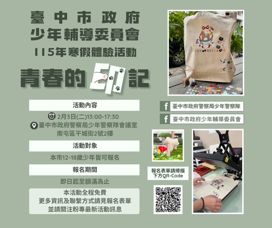 115年寒假體驗活動-海報 【名額已額滿,暫不接受報名】 #活動分享 115年寒假少年體驗活動「青春的印記」開始報名啦 米那桑~寒假真的要來啦 如果還不知道要做什麼 那就來把青春留下一點看得見的痕跡吧 這次的活動是手提袋熱轉印手作課程 可以自由搭配你喜歡的圖案、文字 把想說的話 親手印在專屬於自己的袋子上 做一個只屬於你的寒假紀念品 好看又實用 出門直接背走 有餐盒 請自行前往活動地點 為維持活動品質 名額至多30位 報名時間 即日起至額滿表單關閉 小提醒 因活動需實際操作熱轉印設備 為顧及安全 未滿12歲的孩童不開放候補 感謝您的體諒與配合 報名連結 https://reurl.cc/LQraLy 「活動須知暨家長同意書」下載 https://drive.google.com/....../1JVWsr9xuoq....../view...... 如臨時不克參加 應於1/30中午前主動電聯取消報名 避免影響自身權益 這個寒假 一起動手做點有記憶點的事吧 #少年英雄聯盟 #反毒 #反詐 #臺中市政府警察局少年警察隊 #臺中市政府少年輔導委員會